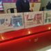 Полка с подарочными пакетами разных цветов и дизайнов в магазине.